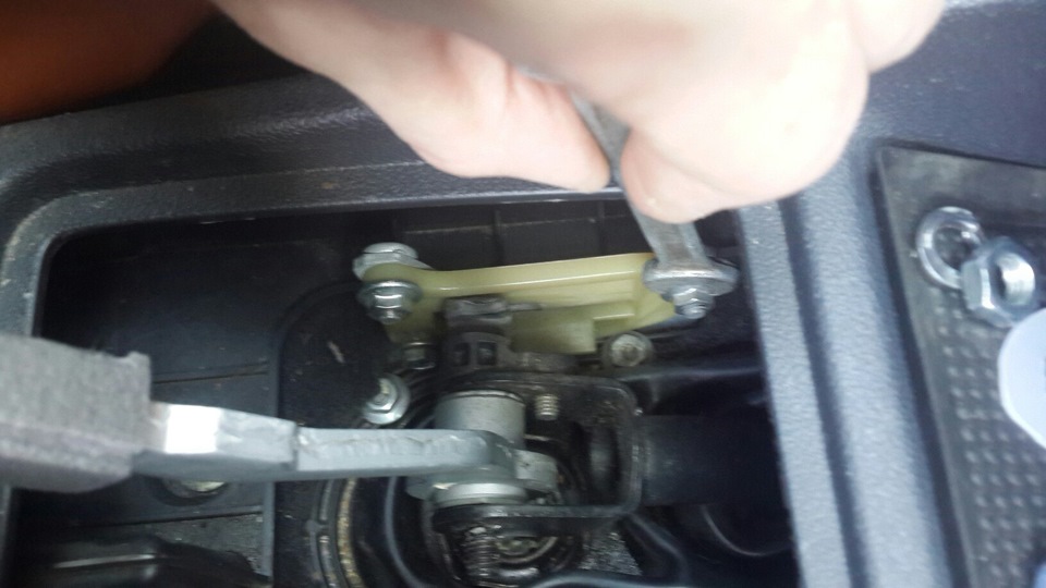 - Снимаем с рычага КПП кожух и поднимем вверх (рычаг КПП остается на месте). С помощью ключа на «13»откручиваем гайку.Откручивание гайки