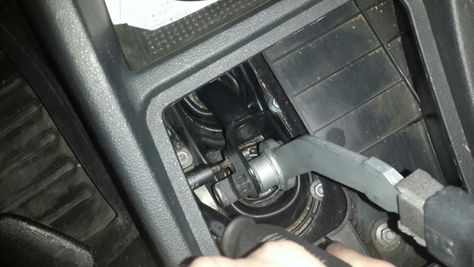 Далее от нижнего конца рычага отсоединяем тягу привода управления КПП и отводим тягу в сторону.