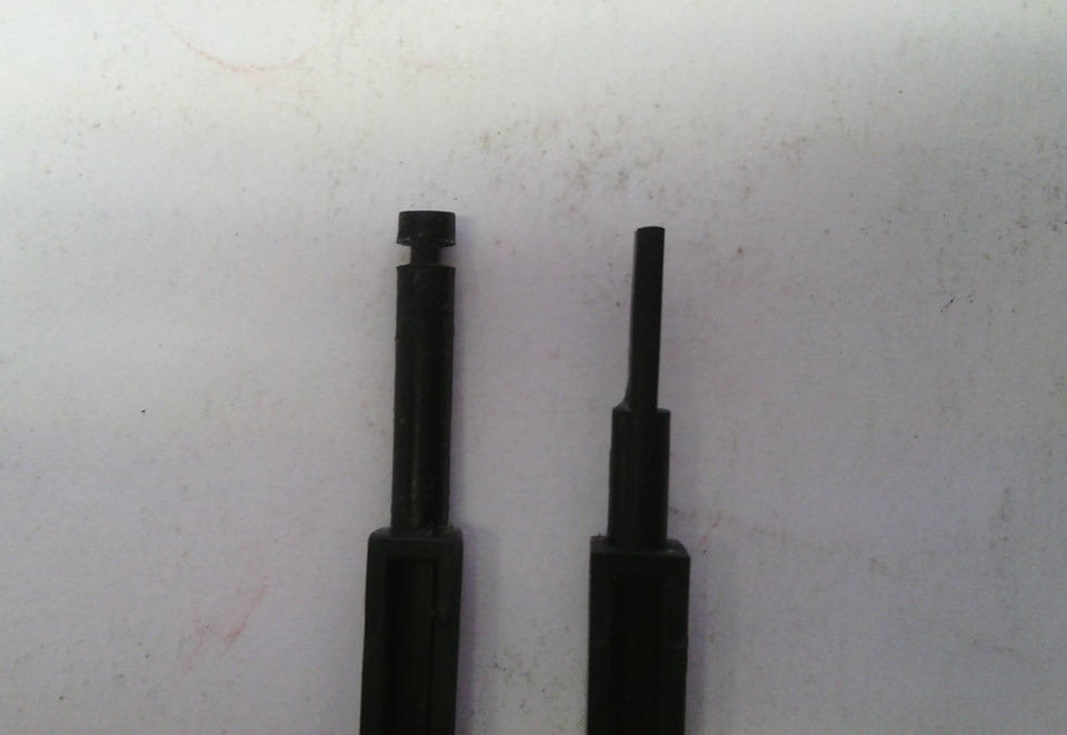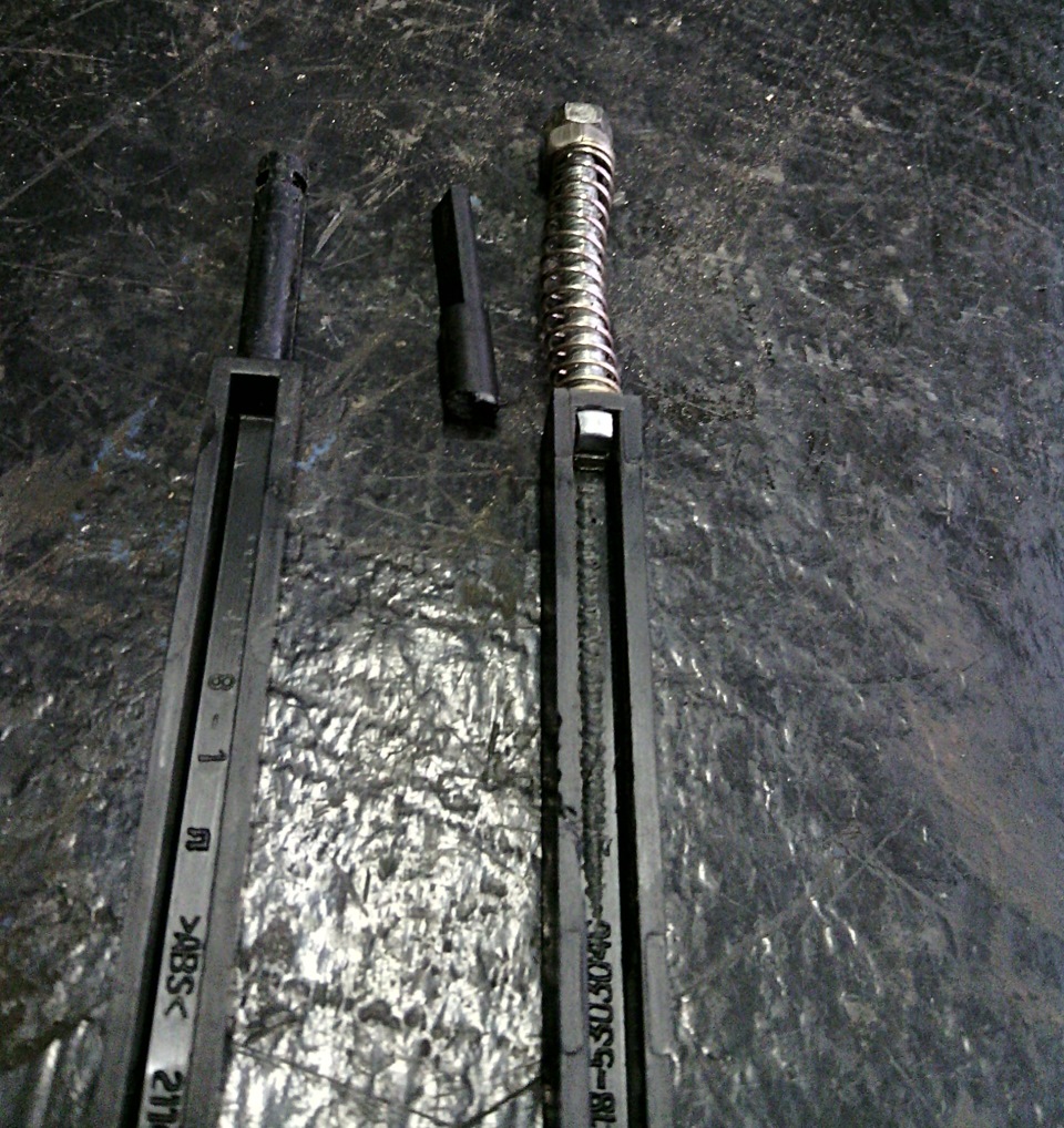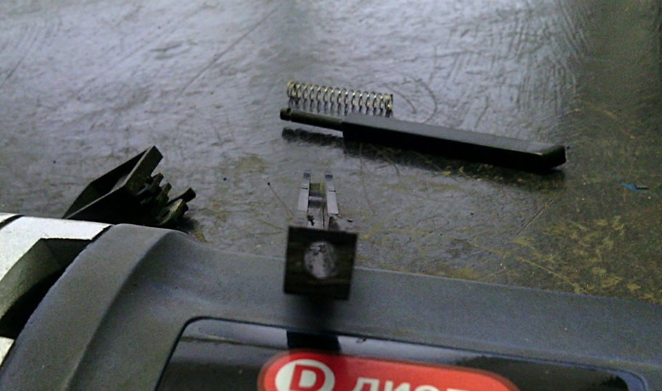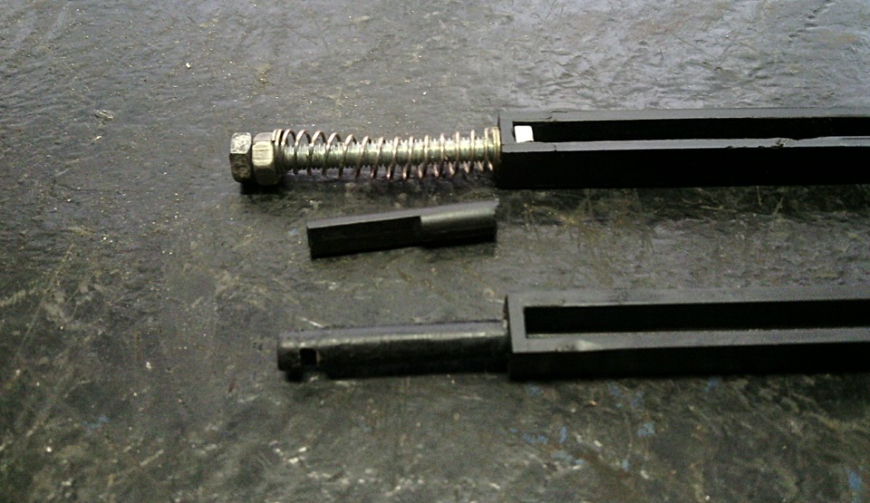 Я взял болт 3-ку с достаточной длиной для замены пострадавшего пластикового стержня. Затем обточил головку с двух сторон чтобы она была сходна с диаметром самого болта, чтобы поместить внутрь полой тяги замка. Далее Вам будет все ясно из фотографий. Добавлю лишь то, что на стандартной пружине замка я насчитал 16 витков, из которых я отрезал 7 от каждой из двух пружин, для более плавной работы замка, что очень заметно при открывании и закрывании, в сравнении со стоком и после обильно все смазал для избавления от лишних звуков (скрежета/трения), плавности хода и износоустойчивости