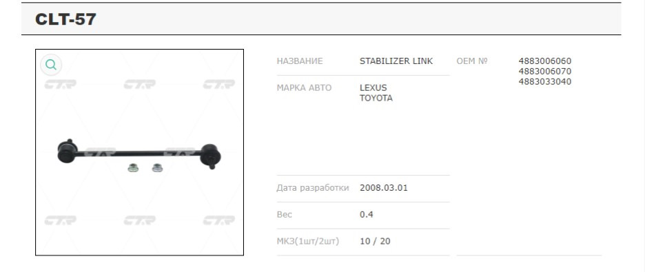 Оригинал 8450006750 (=8450032566) Лада Их длина 275 мм — ходят не долго, чаще всего требуют замены до 10 тыс км. Причина, увеличенный ход подвески;Аналог БЗАК 906611 — говорят покрепче, но тоже ходят меньше, чем хотелось бы. Отзывы подробно не смотрел, можете исследовать сами;Аналог 48820-42020 от Toyota RAV4. Они длиннее штатных = 283 мм. Вроде ходят, берут не оригинал, тк он дорогой, а корейские аналоги хороших производителей, до 800 руб за шт. По длине еще инфа будет ниже;Аналог CTR CLS-3, длина стойки 270 мм. — Ходят 10-20 тыс, у всех по разному. Главное брать оригинал CTR;Аналог ”555” производство Япония, длина 265 мм. — ходят, чуть лучше CTR, говорят, но мало кто ставит. Есть проблема с длиной — читать ниже;Аналог CTR CLT-50 с длиной 285.9 мм от Toyota RAV4. Резьба пальца M10xP1.25. Народ ставит, длиннее родных. Не стал их брать. Вроде ходят не плохо;Аналог CTR CLT-57 с длиной 261 мм (Они короче оригинальных) от Toyota Camry 2011 и Lexus ES350. Резьба пальца M10xP1.25.Этот вариант я подобрал сам, с помощью официального сайта CTR с онлайн каталогом. По артикулу можно получить инфу по детали.Поиск продукта CTR