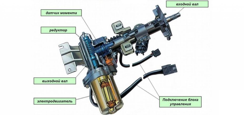 Когда автомобиль совершает поворот, активизируется электроусилитель, с помощью электромотора происходит обеспечение момента. После чего датчик совершает измерения показателей, направляет их на электронный блок управления. Исходя из градуса поворота и его резкости, блок рассчитывает нужную мощность и подает ее.
