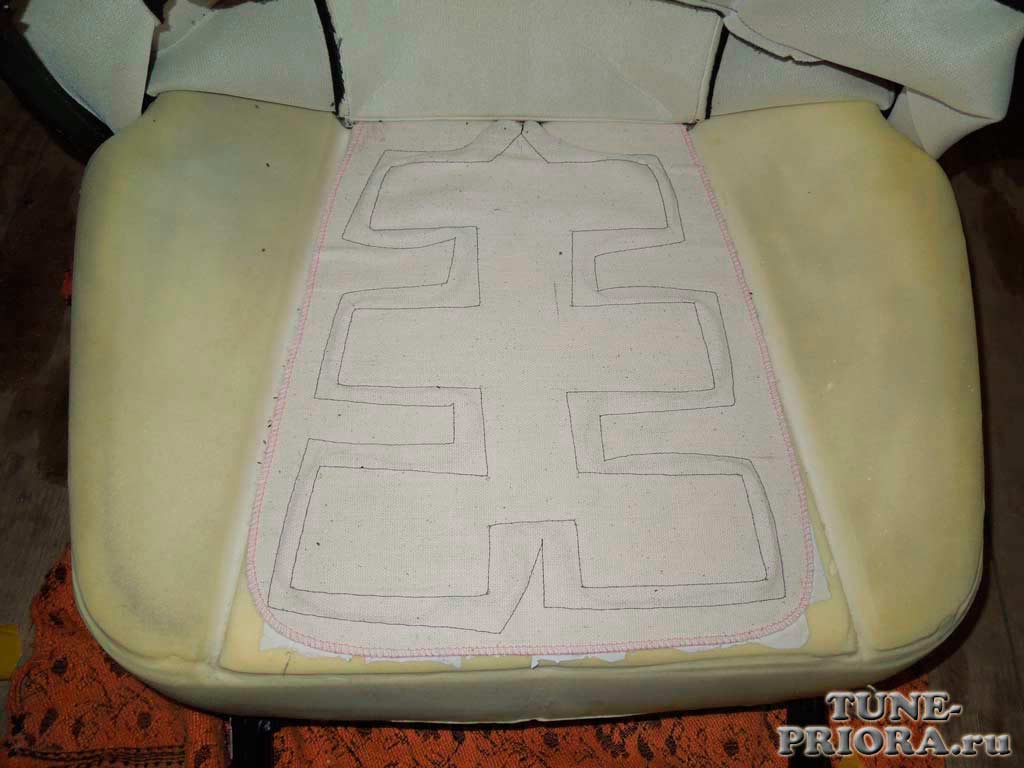 Натягиваем обивку на спинку сидения и фиксируем ее зажимами.