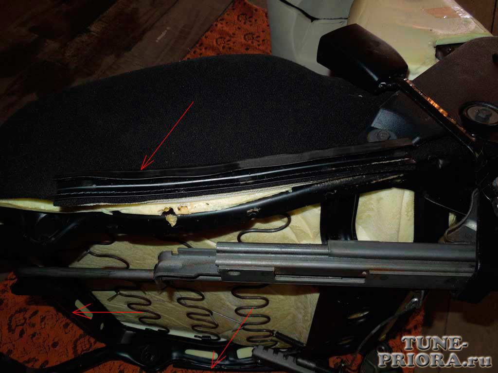 Отгибаем пластиковые фиксаторы обивку сидения и задираем обивку вверх.