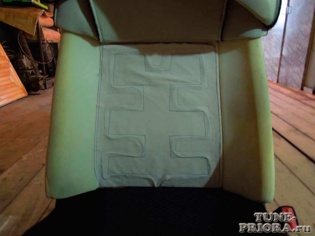 Цель предварительного позиционирования – добиться такого расположения нагревателей, чтобы провода выходили в стык спинки и сидения. Играть с продольной базой не получится – штатный комплект рассчитан строго по размерам впадин. Сняв защитную ленту, приклеить элемент к каркасу. При необходимости пеноматериал подрезается для незаметного вывода провода.