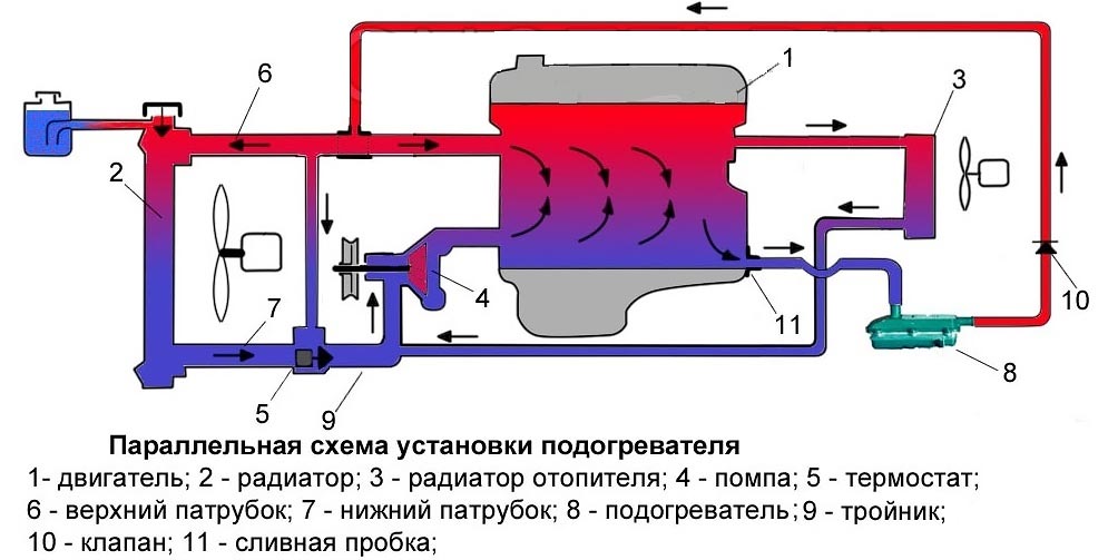 Установка подогревателя двигателя «Старт М» согласно инструкции осуществляется по параллельной схеме. Особенность этой схемы заключается в том, что подача антифриза для разогрева ведется с блока цилиндров.