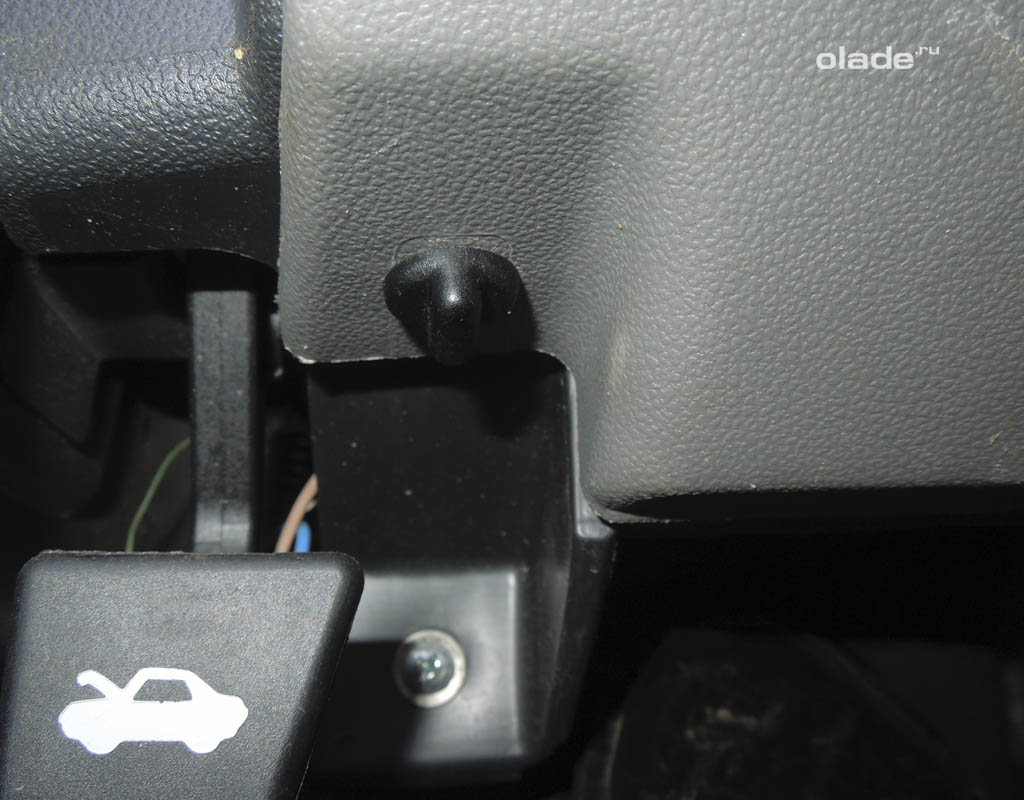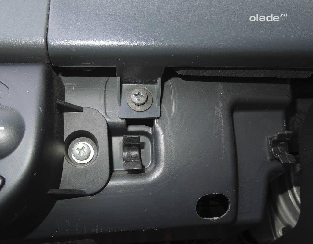 Снимаем панель под рулевой колонкой (сверху просто отщелкиваем, снизу поворачиваем 3 пластиковых крепления). Если приходилось менять предохранители, то снять панель не составит труда.Видим еще 2 болта (один слева, другой справа)