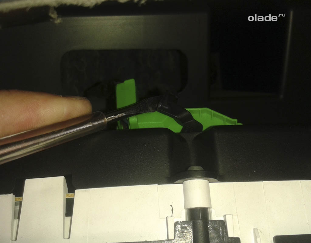 Видим зеленую колодку сзади панели. Отсоединить её просто, но первый раз неудобно. Слегка нажимаем на язычок-упор отверткой и тянем черный рычаг вверх. Штекер сам выйдет из гнезда.