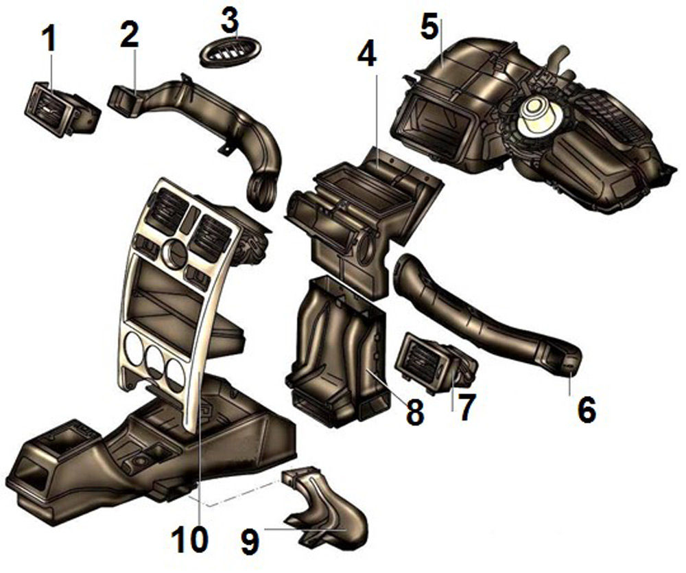 1.Патрубки для подачи воздуха в заднюю часть салона.