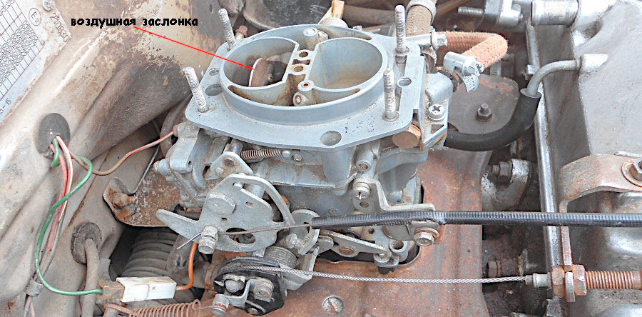 Затем нужно отсоединить тросик, управляющий воздушной заслонкой, и открутить винты, которыми верхняя часть крепится к корпусу. Во время снятия крышки проследите, чтобы не задеть крепления поплавком и не повредить прокладку.