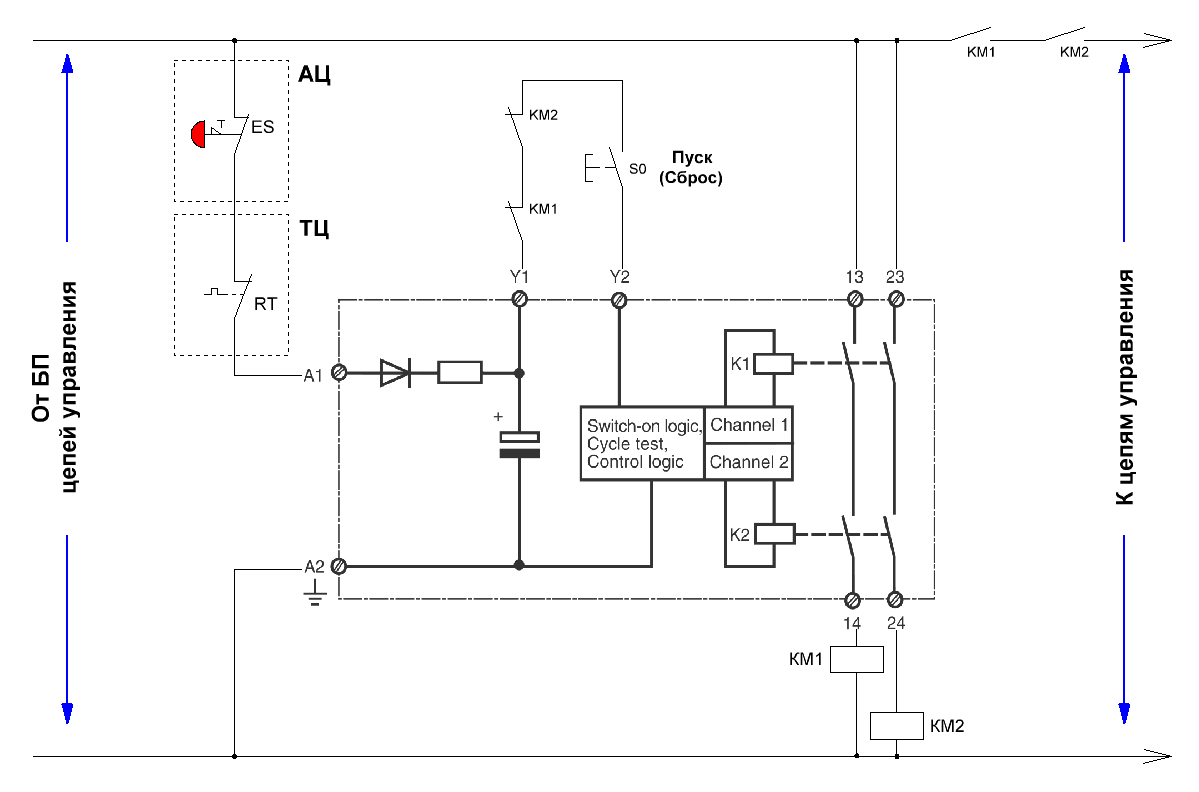Через аварийную цепь (АЦ – кнопки “Аварийный стоп”, кожухи безопасности, двери, и т.п.) и тепловую цепь (ТЦ – тепловые реле, мотор-автоматы, аварийные выходы преобразователей частоты, и т.п.) питание подается на реле безопасности. То есть, если АЦ и ТЦ не в порядке, то реле безопасности не включится, не говоря уж о дальнейшей схеме.