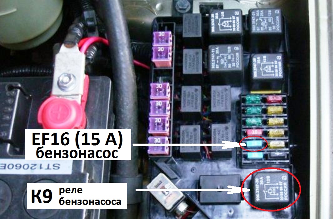 Начнем с того, где находится предохранитель топливного насоса EF16 и реле К9, коммутирующее цепь питания от аккумулятора до бензонасоса.