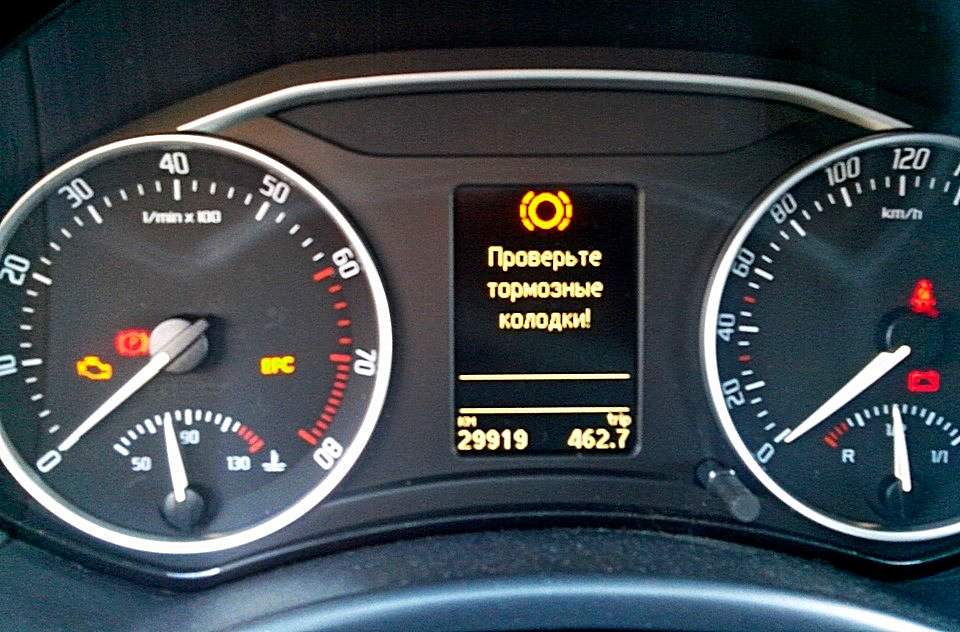 Самый простой вариант. Сработает индикатор износа колодок. Бывает электронный и механический. Электронный — это лампочка на приборной панели. Срабатывает от замыкания на датчике, когда дотрет до металла