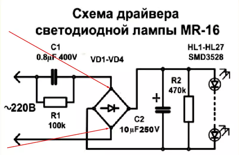Напряжение 220 В подается на драйвер и проходит через сглаживающий конденсатор и сопротивление, ограничивающее ток. Это нужно для того, чтобы обезопасить диодный мост. |