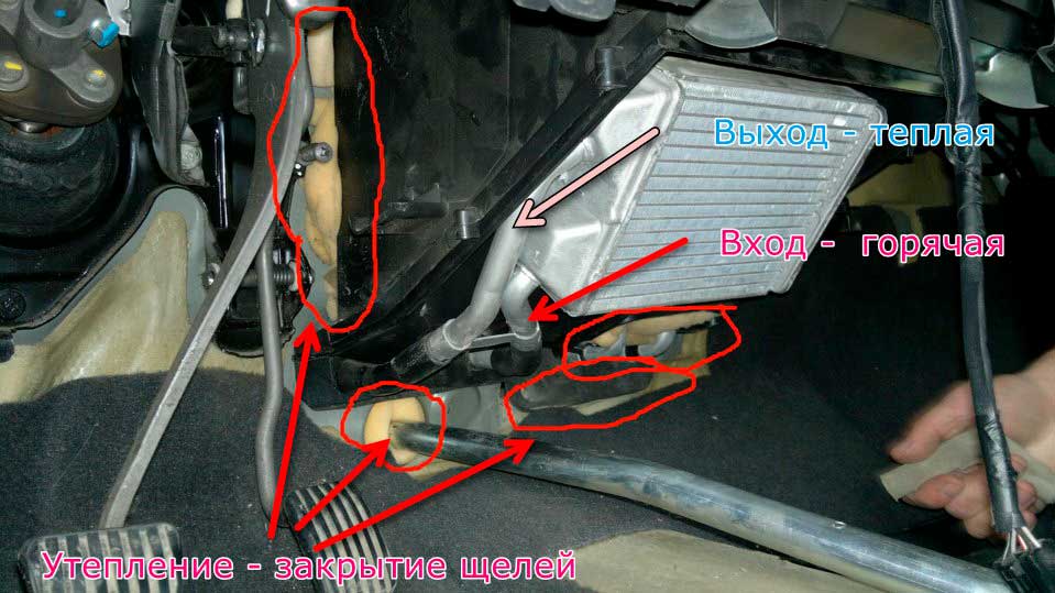 Заводим и прогреваем двигатель. Включаем режим скорости – 2 или 3. Находим два патрубка (под торпедой со стороны пассажира). Правый – подает горячий антифриз, он заходит в радиатор снизу. Левый – отводящий, он должен быть не таким горячим, как первый.