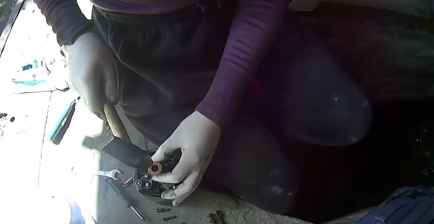 17. Воспользовавшись молотком, забиваем новую втулку на посадочное место.