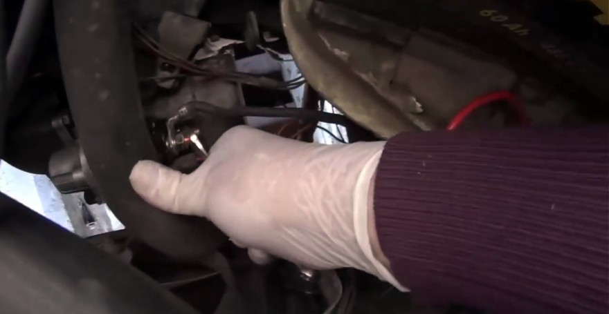 Тонкий провод можно просто вытянуть руками. Для отключения силового нужно ключом на 13 открутить гайку с контакта втягивающего реле. После того как отсоедините провода, уберите их в сторону.