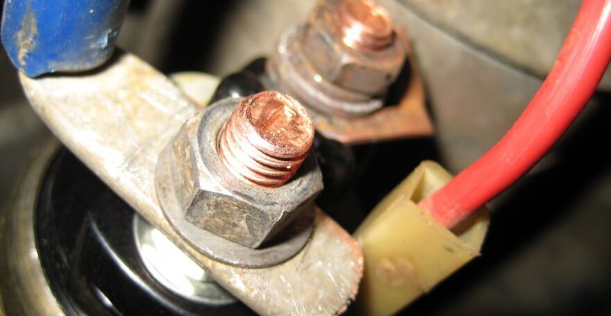 - После снятия втягивающего реле проверьте, замыкаются ли болты контактной пластиной. Для этого вдвиньте якорь до упора внутрь и замерьте сопротивление на контактных болтах с помощью омметра. Если оно отсутствует, замените либо отремонтируйте реле.