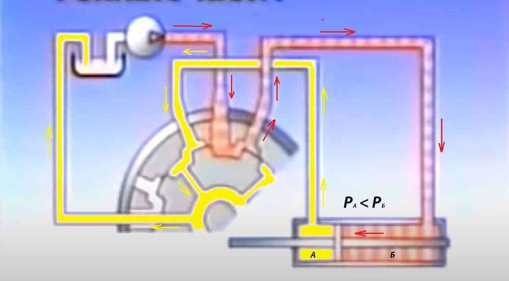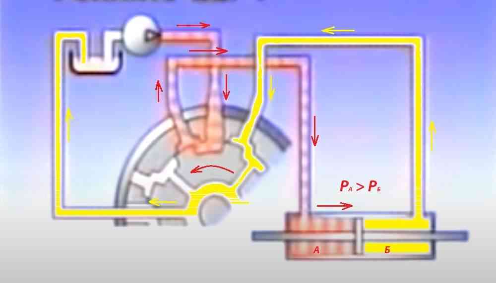 В этот момент в противоположной стороне цилиндра находится жидкость, которую нужно куда-то слить, потому что для её сжатия понадобится дополнительная сила и водителю тяжело повернуть руль влево. В этот момент в распределительном механизме открываются сливные полости, обозначенные желтой стрелкой. Она через них сливается обратно в расширительный бачок ГУР.