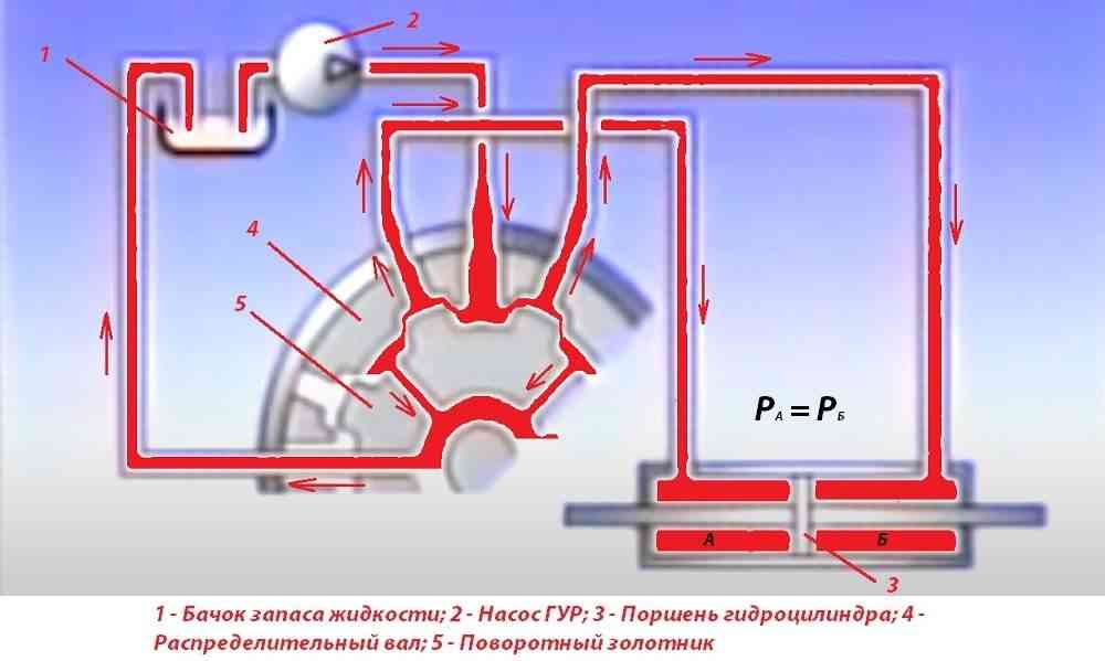 Если перестают вращать руль, вал распределительного механизма возвращается в нейтральное положение. Проходные сечения между валом распределителя и золотником становятся первоначальными. Гидравлическая схема гидроусилителя рулевого управления возвращается в исходное состояние, давление в обеих полостях цилиндра уравнивается, поршень прекращает движение.