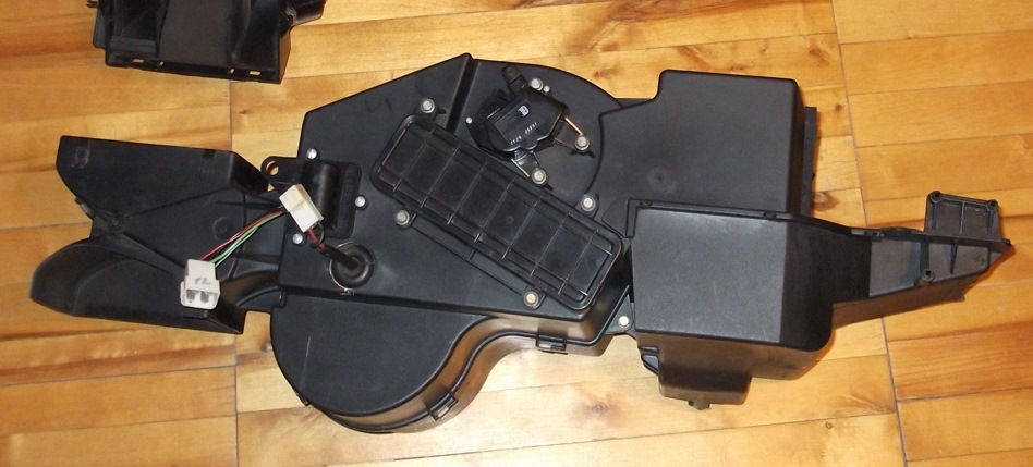 Снимаем центральный воздуховод. Разъединяем колодки проводов отопителя (электронного регулятора частоты вращения электродвигателя отопителя и электровентилятора). Отсоединяем правый и левый распределители отопителя от переходника отопителя. Головкой «на 10» отворачиваем болт нижнего крепления отопителя. Головкой «на 10» отворачиваем гайку верхнего крепления отопителя. Гайка также крепит наконечник провода «массы». Головкой «на 10» отворачиваем две гайки крепления отопителя к коробу воздухозаборника (вторая гайка находится с противоположной стороны короба).