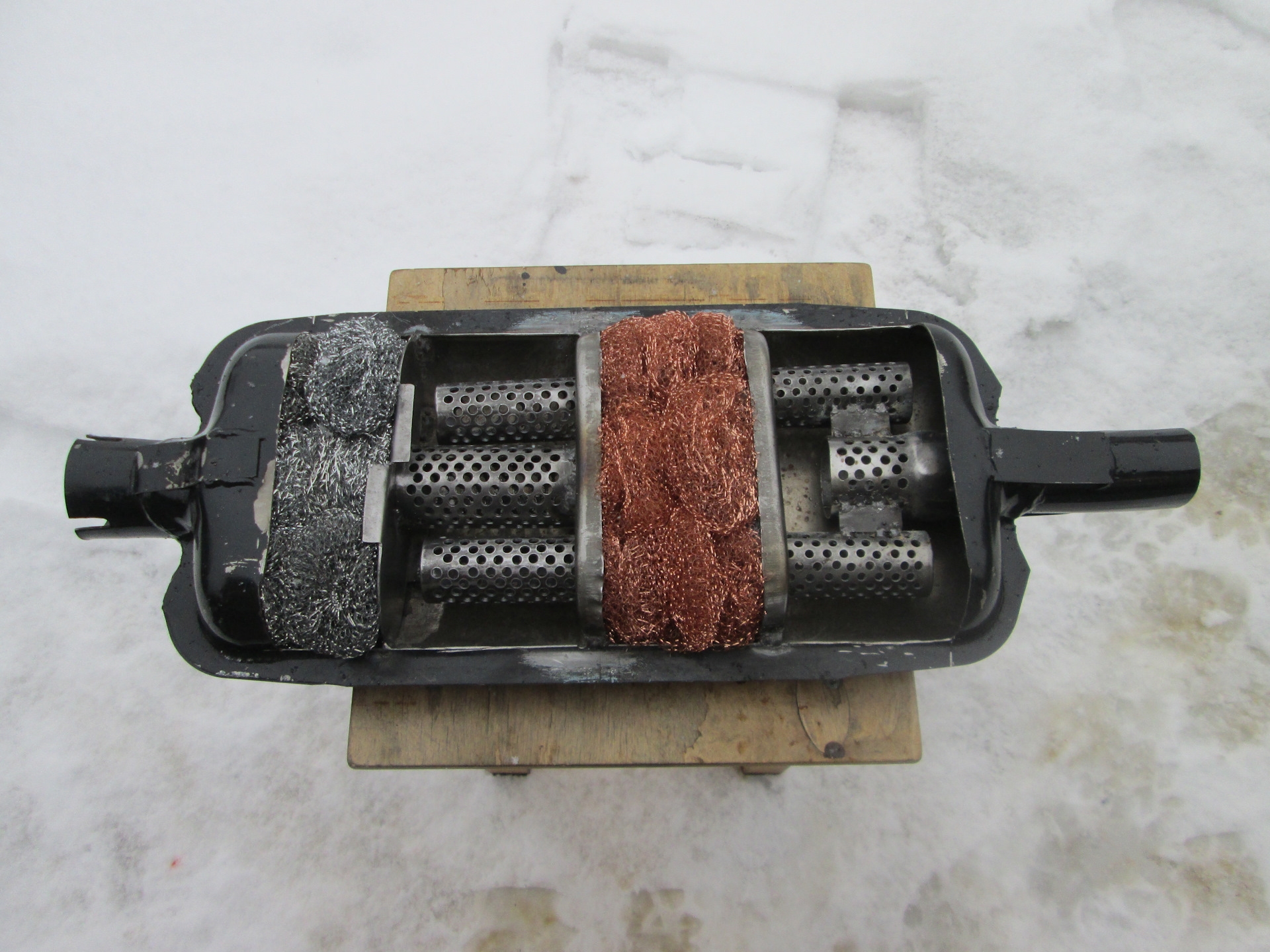 Далее надо резонатор чем-то набить, для этой цели отлично подойдут обычные жестяные мочалки.