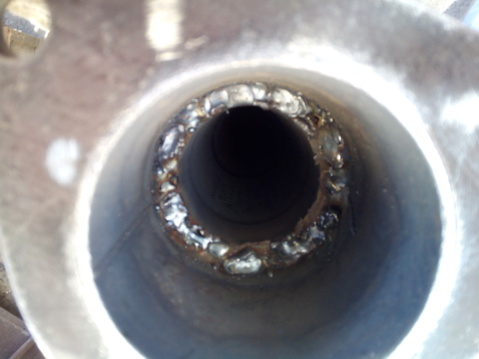 Плохо — это да, но не смертельно. Самое главное что я решил соблюсти правило — труба паука после соединения в одну должна быть определенной длины и заканчиваться резонатором. 701 мм в моем случае (так вышло по размерам паука). А заужение просто даст копейки в сопротивлении выхлопу. Фланец на паук я наваривал прямо не снимая с машины — потому там сварка жуткая Но я все замазал термостойким печным герметиком, потому как еще не полностью доверяю себе в качестве сварщика трубопроводов.