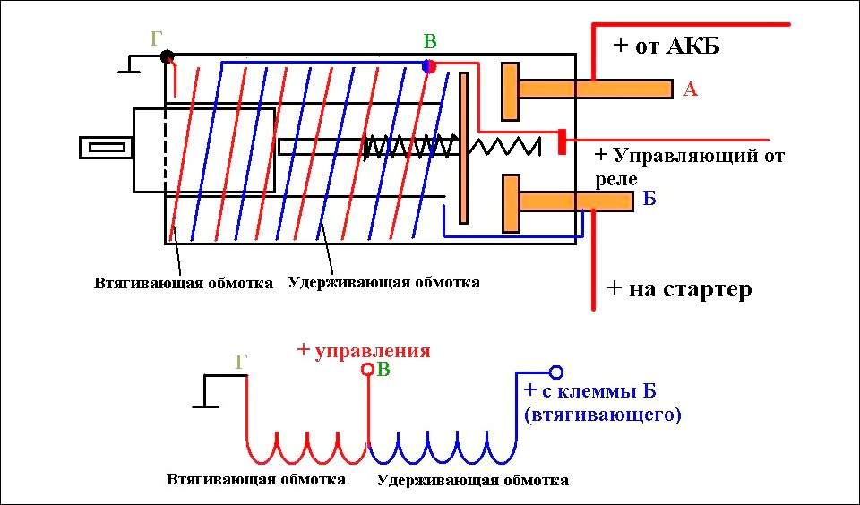 - Замка зажигания, подающего через разгрузочное реле стартера (есть не на всех машинах) пусковой импульс на обмотку тягового.