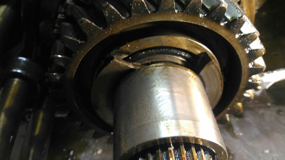 К такому повороту я не был готов, хотя подозревал, что мне может понадобиться и шестерня на вторичке. Финансы не позволили мне набрать все возможные варианты, потому этой шестерни я не имел в запасе. До закрытия магазина оставалось 30 минут, потому я ломанулся в магазин что ошпаренный. Обменял шестерню, приехал в гараж, подошёл к верстаку и опупел ещё раз. Среди обломков зубьев шестерни лежал обломок, явно не принадлежавший к зубчатым колёсам. Разглядел валы повнимательнее, и нашёл ещё одну убитую деталь, упорное кольцо: