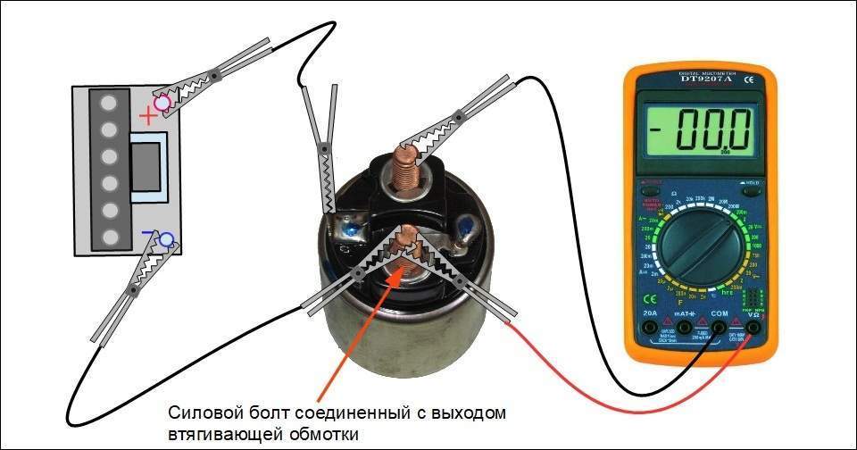 На электродвигателе сверху расположено втягивающее реле с двумя видами обмоток: удерживающей и тяговой.