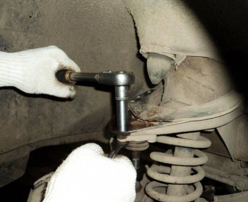 Ослабить гайки нижнего и верхнего шарового шарнира, но полностью не откручивать.