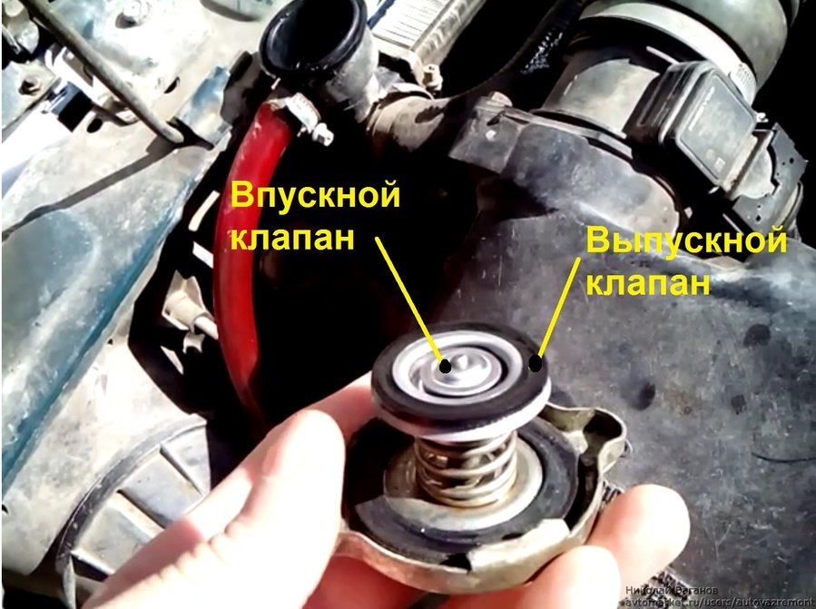 Как мы знаем, система охлаждения двигателя является герметичной, а для регулирования перепадов температур и соответственно объема охлаждающей жидкости на крышке радиатора имеется 2 клапана – впускной и выпускной.