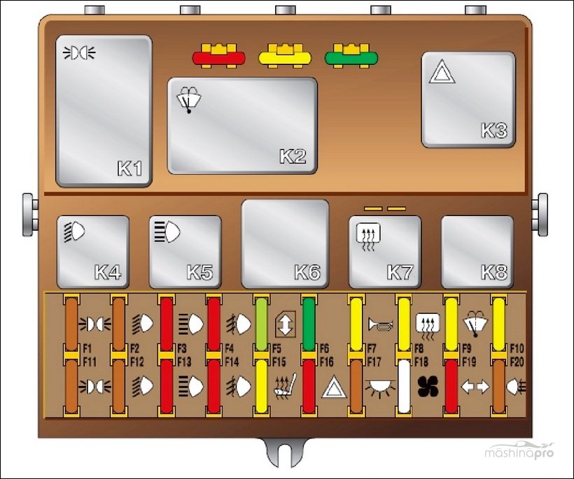 основном блоке ВАЗ находится 20 предохранителя и 8 реле. Их расположение