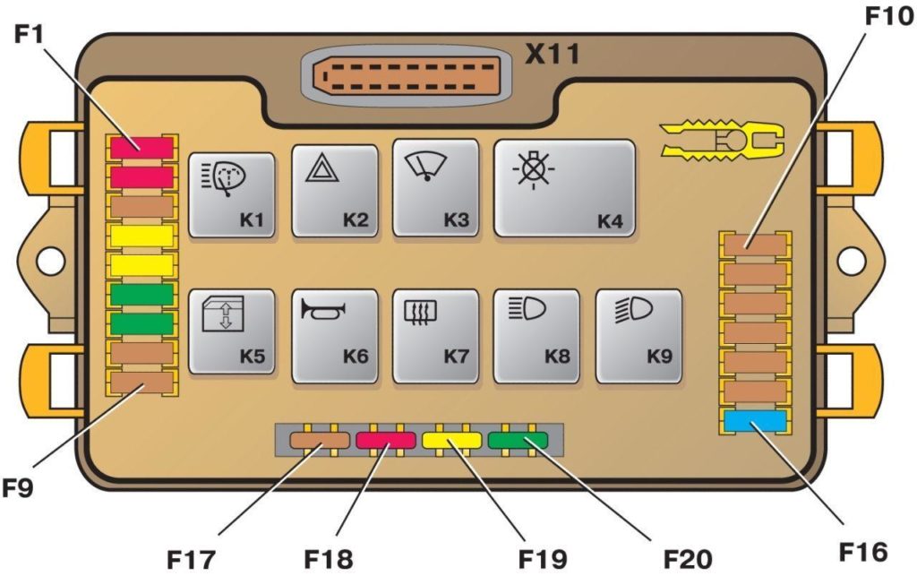 | F2(10A) | Лампы указателей поворота. Реле-прерыватель указателей поворота и аварийной сигнализации (в режиме аварийной сигнализации). Контрольная лампа аварийной сигнализации |