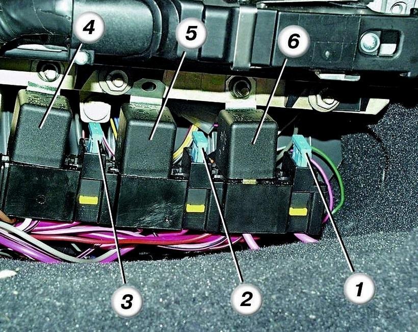 Чтобы добраться до дополнительного блока, расположенного по центру приборной панели, с правой стороны нужно открутить шурупы на панели и демонтировать пластиковую защитную крышку. В нем находится 6 реле-предохранителей с одинаковой силой тока – 15А.