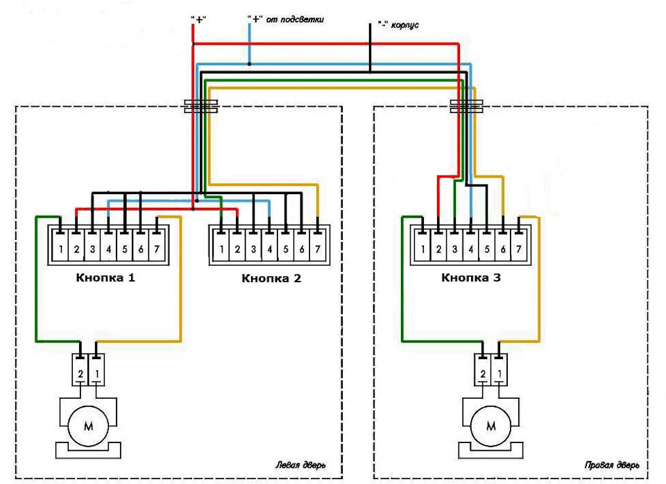 Скорее всего — кнопка на правой двери сейчас подключена на прямую. Контакты по номерам (номера есть на колодке кнопки) №1 — голубой (черно -голубой) провод мотора подъемника №2 — + питания подъёмников №3 — масса №4 — + подсветки №5 — масса подсветки №6 — масса №7 — серый (черно-серый) провод мотора подъемника