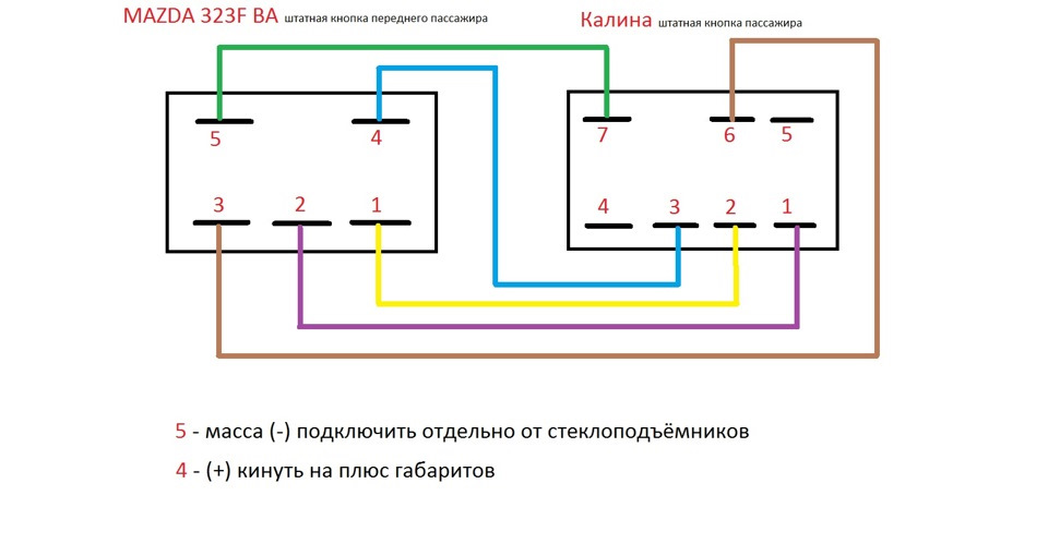 Что надо сделать 1. контакт №3 основной кнопки — отключить от массы и подключить к контакту №7 дублирующей кнопки (в водительской двери). 2. контакт №6 основной кнопки — отключить от массы и подключить к контакту №1 дублирующей кнопки. Больше на основной кнопке ни чего не трогаем. Оставшиеся контакты дублирующей кнопки подключить №2 + питания подъёмников №3 — масса №4 — + подсветки №5 — масса подсветки №6 — масса Лучше их запитать от соседней кнопки (водительского стеклоподъемника) После подключения доп. кнопки — она должна работать паралельно основной, но при нажатии сразу 2х кнопок -стеклоподъемник будет останавливаться. (защита от КЗ при одновременной команде вверх 1й кнопки и одновременно — вниз 2й)