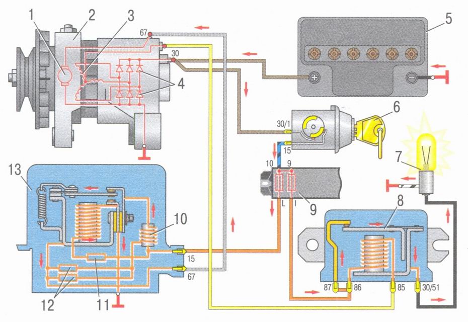 Таким образом, для выработки генератором электричества используется шесть катушек. Больше, чем на несколько секунд, АКБ не отключайте, поскольку это приведет к неработоспособности диодного моста. При повороте ключа зажигания, до начала работы двигателя и генератора на контакты реле подается ток от аккумулятора автомобиля и контрольная лампа зажигается. Фонарь освещения номерного знака. Шкив при работающем двигателе вращается коленвалом через ремень и передаёт вращающий момент ротору.