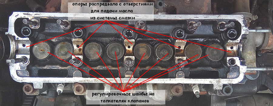 Смазка распределительного вала производится под давлением через отверстия в опорах головки блока.