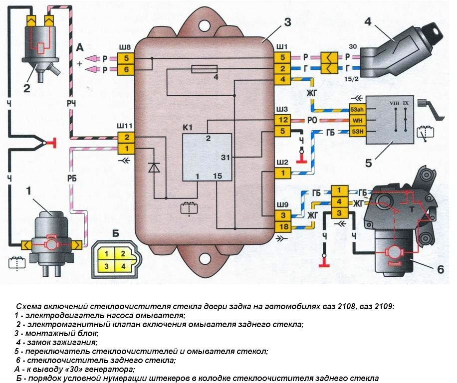 Рис. 9.22. Схема включений стеклоочистителя стекла двери задка на автомобилях ваз 2108, ваз 2109: 1 — электродвигатель насоса омывателя; 2 — электромагнитный клапан включения омывателя заднего стекла; 3 — монтажный блок; 4 — замок зажигания; 5 — переключатель стеклоочистителей и омывателя стекол; 6 — стеклоочиститель заднего стекла; А — к выводу «30» генератора; Б — порядок условной нумерации штекеров в колодке стеклоочистителя заднего стекла