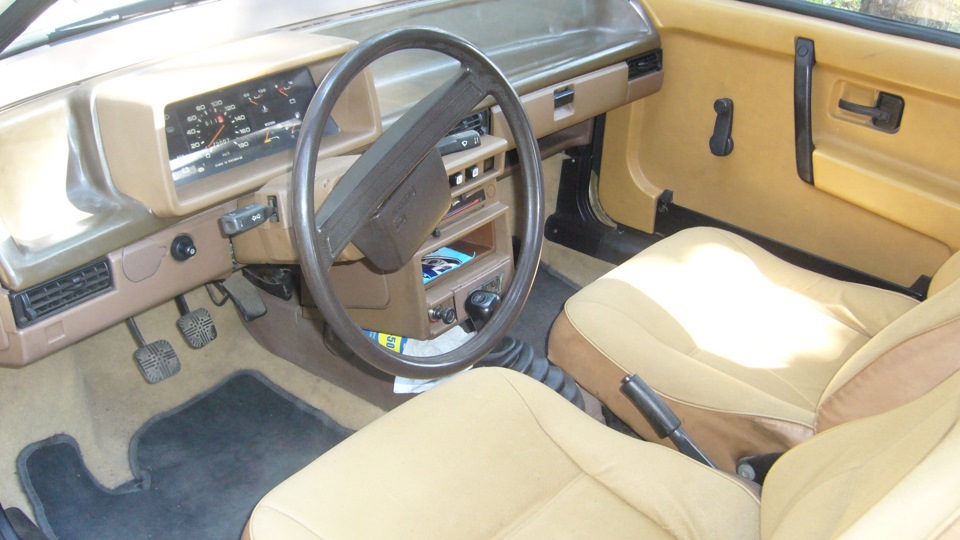 Желтый салон, ранний темно-коричневый югославский руль, накладка панели с годами выгорела и потемнела. Встречались ранние экземпляры, когда тоннель, пепельница — были черными) в салоне все это конечно выглядит не как одно целое, полагаю сызраньский завод пластиковых деталей, что успевал, то и поставлял.