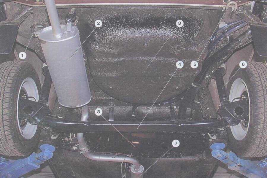 Вид задней части автомобиля снизу 1 — подвеска глушителя; 2 — глушитель; 3 — ниша запасного колеса; 4 — задняя балка; 5 — буксирная проушина; 6 — задний амортизатор; 7 — резонатор; 8 -топливный бак
