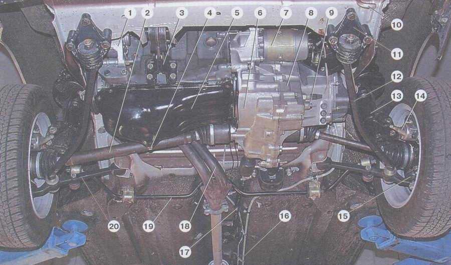 Вид передней части автомобиля снизу (защита двигателя снята) 1 — генератор; 2 — полуось привода колеса со ШРУСами; 3 — опора двигателя; 4-сливная пробка; 5 — масляный картер; 6 — картер сцепления; 7 — стартер; 8 — коробка передач; 9 — сливная пробка; 10 — буксирная проушина; 11 — кронштейн растяжки; 12- растяжка; 13 -стойка передней подвески; 14-тормозной цилиндр; 15 — шаровая опора; 16 -топливопровод; 17 -тягауправления коробки передач; 18 — приемная труба глушителя; 19 — стабилизатор; 20 — рычаг
