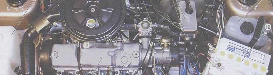Подкапотное пространство автомобиля с карбюратором 1 — чашка стойки передней подвески; 2 — бачок омывателя; 3 — корпус воздушного фильтра; 4 — топливный насос; 5 — рулевой механизм; 6 — датчик распределителя; 7 — вакуумный усилитель тормозов; 8 — тормозной цилиндр с бачком; 9 — коммутатор системы зажигания; 10 — блок предохранителей; 11 — расширительный бачок; 12 — аккумуляторная батарея; 13 — упор капота; 14 — катушка зажигания; 15-стартер; 16 — высоковольтные провода; 17 — маслоналивная горловина; 18-двигатель; 19 — свеча зажигания; 20 — насосы омывателя