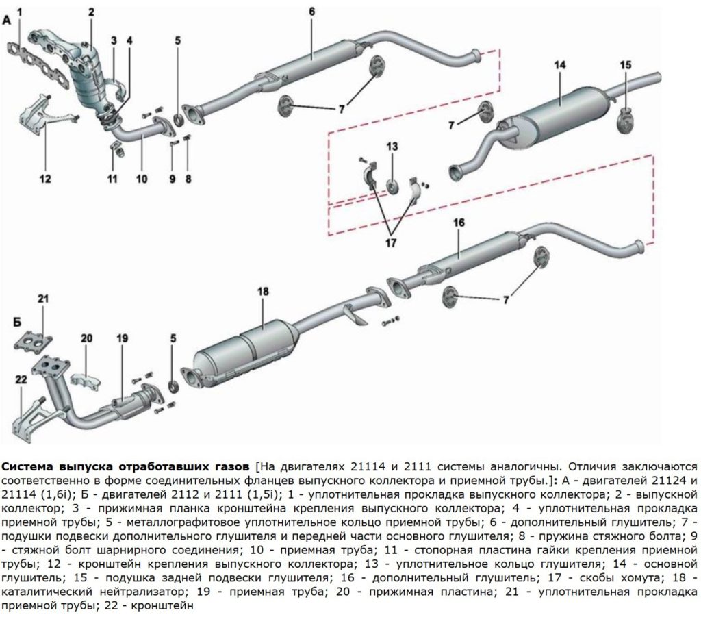 Выхлопная система для автомобиля ВАЗ 2110 состоит из следующих элементов: