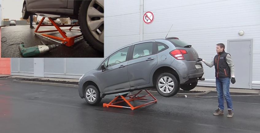 В последующем время работ немного снижается за счет получения автовладельцем некоторого опыта. При необходимости может использоваться домкрат или ручные самодельные подъемники, например, как на нижнем фото. Это актуально, если потребуется снять переднее колесо со стороны пассажира.
