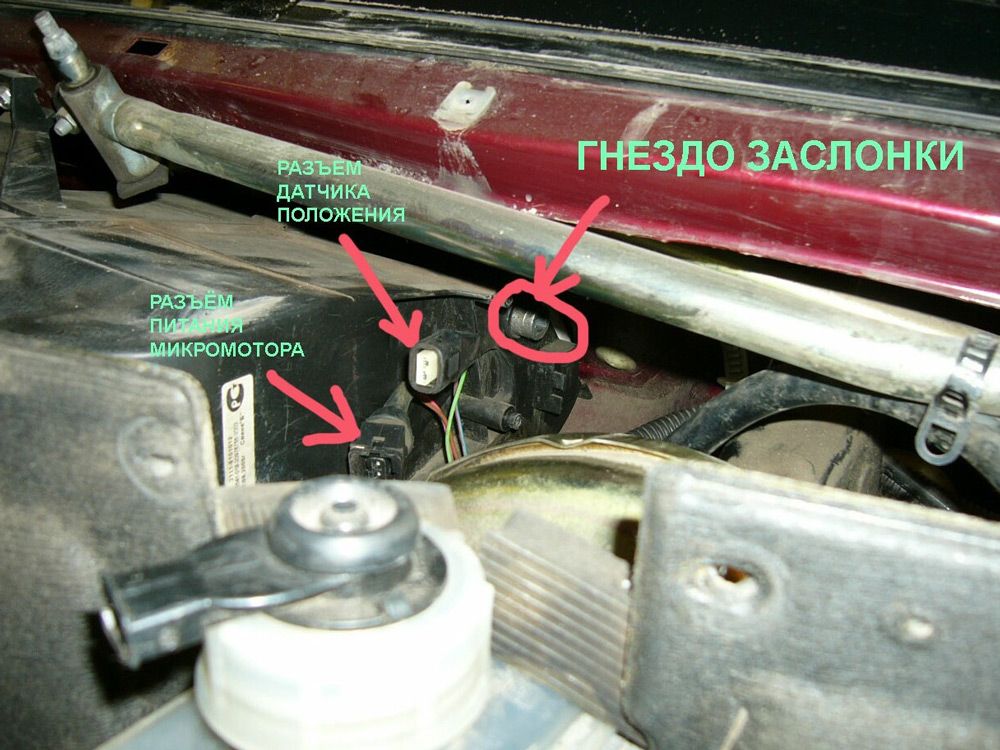 - Моторчик располагается слева в отеке редуктора заслонки, прямо возле тормозного усилителя.